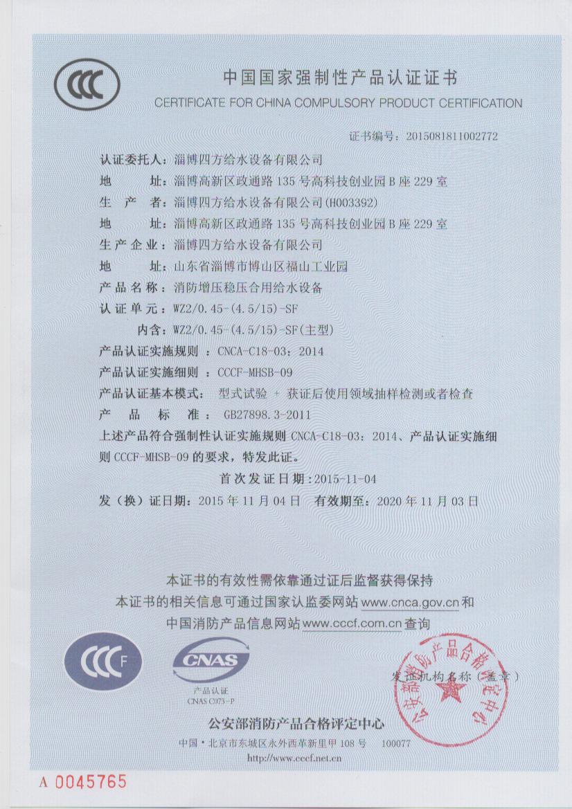 我公司生產(chǎn)的消防增壓穩(wěn)壓合用給水設(shè)備近期獲得中國(guó)國(guó)家強(qiáng)制性產(chǎn)品認(rèn)證證書(shū),由公安部消防產(chǎn)品合 格評(píng)定中心,于2015年11月4日正式頒發(fā)認(rèn)證證書(shū),成為本地區(qū)首先獲得消防3C認(rèn)證證書(shū)的企業(yè)。